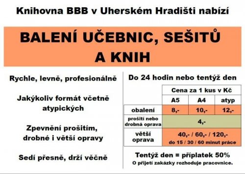 Od pondělí 24.8.2015 nabízíme v knihovně opět BALENÍ UČEBNIC, SEŠITŮ A KNIH.